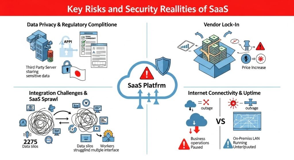 While the benefits are substantial, a comprehensive analysis of SaaS とは must also address the “Achilles’ heel” of the model: security, dependence, and the loss of absolute control.7